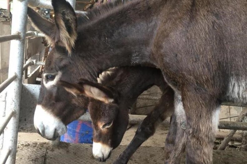 A female parent ass and her infant huddled together in a small metal corral. In less than 24 hours, they were set to be shipped to Mexico and slaughtered for their meat.